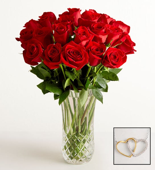 The ultimate in luxury. Two dozen red roses are gathered in our exclusive Posh™ vase, crafted with artful precision to display the meticulous clarity of traditional lead crystal. For even more sparkle, add a necklace that spells out “MOM” in glittering letters.